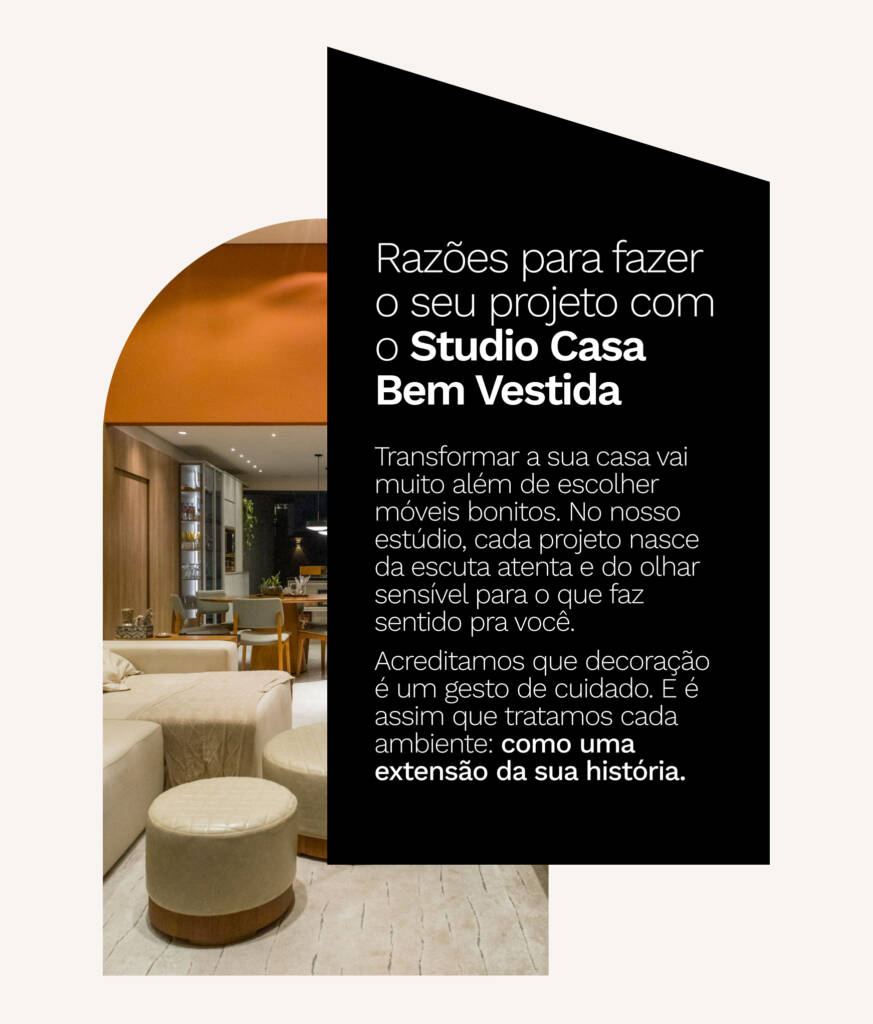 Nosso olhar vai além da estética: buscamos soluções originais que tenham sentido real para quem vai habitar o espaço. Com isso, entregamos experiências autênticas e significativas.